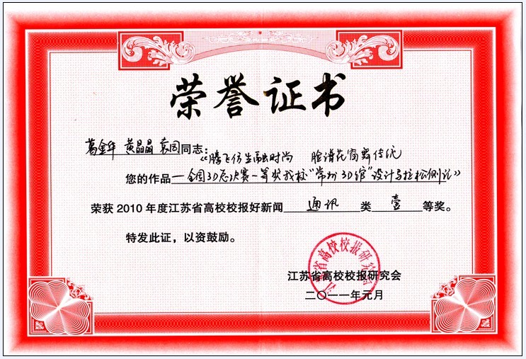 近日,江苏省高校校报好新闻评选工作在徐州落下帷幕,我校校报编辑部主任葛金华老师带领校学通社记者黄晶晶、袁园采写的通讯《腾飞仿生融时尚 脸谱花窗舞传统—全国3D总决赛一等奖我校“常州3D馆”设计马拉松侧记》喜获江苏省高校校报好新闻通讯类等一奖。我校陈鸿、王少莽、葛金华等三位老师联合采写的通讯《寻声徒手就挖 废墟中生命最贵—我校环安院研究生张志祥第一时间深入玉树救出一位藏族老人》喜获通讯类三等奖。我校也是本次省高校校报好新闻评选中唯一获得一等奖的在常高校。