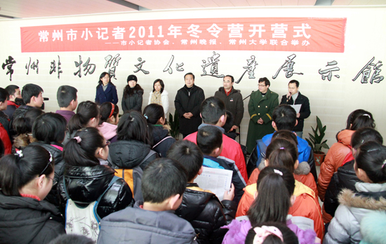 1月24日上午,由常州市小记者协会、常州晚报和我校联合举办的“常州市小记者2011年冬令营”在我校图书馆四楼常州非物质文化遗产展示馆正式开营。常州市小记者协会副会长、常州日报社副社长金仲良,常州晚报副总编黄幼文,我校宣传部长李伟明,丽华二小副校长韦晶,常州晚报要闻部主任陆文,常州市小记者协会副秘书长、常州晚报要闻部副主任王芳,常州市小记者协会副秘书长常城等领导出席开营仪式,陆文主任主持仪式。来自常州实验初中、丽华二小等学校的200多名小记者参观了我校常州非物质文化遗产展示馆和我校石化工业中心。