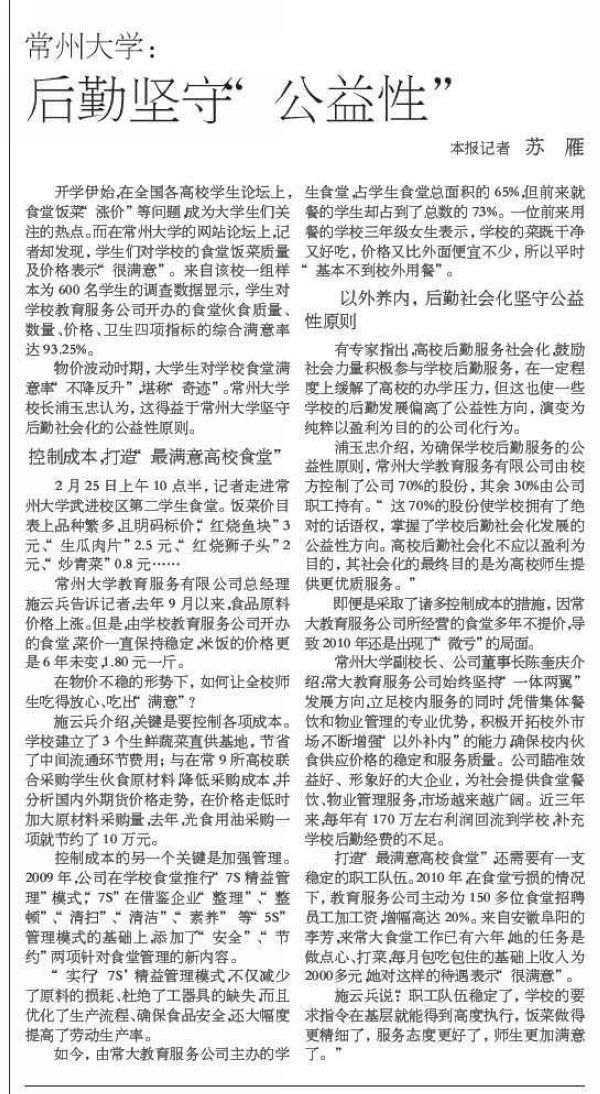 浦玉忠介绍,为确保学校后勤服务的公益性原则,常州大学教育服务有限公司由校方控制了公司70%的股份,其余30%由公司职工持有。“这70%的股份使学校拥有了绝对的话语权,掌握了学校后勤社会化发展的公益性方向。高校后勤社会化不应以盈利为目的,其社会化的最终目的是为高校师生提供更优质服务。”