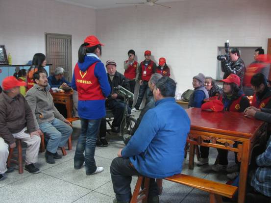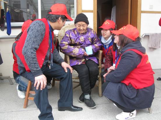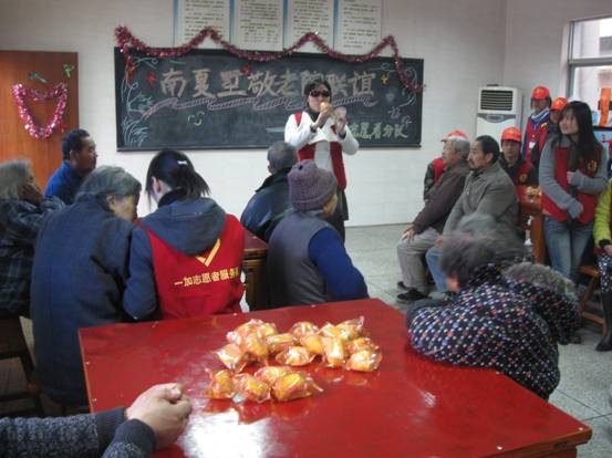 下午12点50分,志愿者们抵达南夏墅敬老院,在短暂的分工之后,志愿者们忙碌起来,他们细心的擦窗台上的灰尘、清扫角落的积垢,有些志愿者与老人相伴而坐,亲切地拉起了家常。在近一个小时的忙碌后,志愿者们将老人一一搀扶至餐厅,联谊表演也随即开始。
