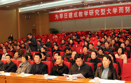 史国栋书记指出,学校近几年在办学规模、办学质量、办学条件、人才队伍建设、学科建设等许多方面都取得了显著的成绩。这是大家齐心协力,共同奋斗的结果。学校“十二五”期间要建成教学研究型大学,实现跨越式发展,必须在教学中,通过强化教学质量来抓国家级教学成果奖培育工程、国家级教学名师培育工程、国家级精品课程培育工程等相关奖项的培育,提高教学质量,夯实学校发展的根本。在人才工作中,打造亮点,落实人才优先发展战略,学校在人才引进上,要有魄力,在人才培养上,要有定力。在科研工作中,要建立科学的科研评估体系,出台学术规范和标准,进行“有效科研”。学校以全面提高学科地位和学术水平为目标,以提高科技自主创新能力为核心,以学科建设为主线,以条件平台建设为依托,以重点项目课题为支撑,以体制机制创新为保障,以培养、引进学科领军人才为重点,以培养学术骨干和人才梯队为基础,精心打造科研团队,增强自主创新能力。