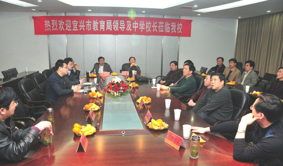 4月9日,宜兴市教育局副局长柳志贤、副局长蒋铁伟带领宜兴地区中学校长一行23人到我校参观交流。