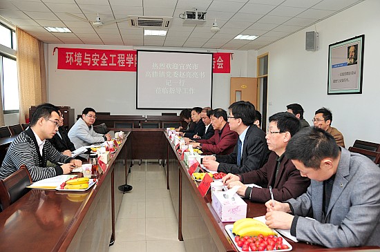 4月12日上午,宜兴市高塍镇党委副书记赵亮亮,江苏省十佳创业明星、江苏省新长征突击手、宜兴市星晨水汽净化设备有限公司总裁丁叶民,副总周健,徐舍镇党委副书记、我校材料学院李海博士,来校洽谈产学研合作事宜。校党委副书记王凯全出席会议并讲话,党办、校办主任陆锦冲,研究生部副部长陈若愚,环境学院党政领导和相关专业教师参与洽谈。