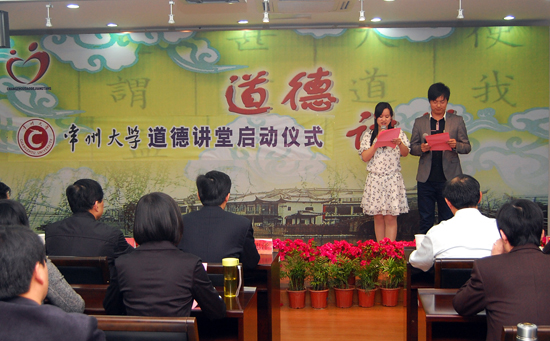 常州市委宣传部副部长汪忠泽宣布常州“道德讲堂”走进常州大学启动仪式开始;我校经济管理学院莫琦老师代表全校教师宣读“践行师德创先争优,爱岗敬业爱生爱校”倡议书;我校环保志愿者组织代表陈伊娉宣读“弘扬道德文化,共建文明城市”倡议书。