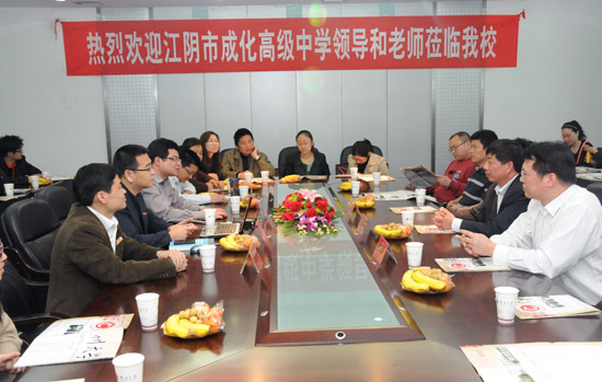 陈奎庆副校长对成化高级中学领导老师的到来表示热烈欢迎,对成化高级中学多年来为我校输送优秀生源,支持我校事业发展表示衷心感谢。陈奎庆副校长介绍了学校的发展历史、办学特色、2011年招生计划以及我校在教学、科研等方面的取得的成绩。双方就学生管理、校园文化建设及2011年江苏省高考相关问题进行了深入的交流。