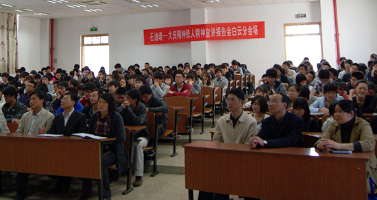 首席宣讲员苏爱华、何德全进行宣讲,他们用满怀深情的语言,图文并茂地描述了大庆油田艰苦卓绝、波澜壮阔的石油大会战,详细介绍了在石油大会战的大熔炉里形成的一整套大庆优良传统和优良作风,再现了中国石油工人的光辉典范王进喜从一名普通钻工成长为全国闻名的铁人、铸就石油之魂的人生历程,深刻阐释了大庆精神、铁人精神的形成过程和丰富内涵,揭示了大庆精神、铁人精神对几代艰苦奋斗、甘于奉献的石油人的引领和激励作用。生动的报告感人至深,催人奋进,现场许多同学留下了感动的泪水。