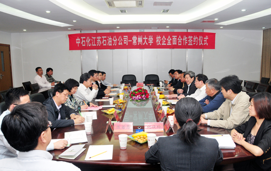 5月5日下午, 我校与中石化江苏石油分公司全面合作签约仪式在我校第二会议室隆重举行。中石化江苏石油分公司吕建华总经理、冯培育副总经理携公司主要领导及常州石油分公司蒋琦总经理、杨南忠书记出席签约仪式。校党委书记史国栋、校长浦玉忠、副校长王卫星出席签约仪式,两办、行业服务办、科技处、研究生部、继续教育学院、设计研究院等部门负责人共同参加了签约仪式。副校长王卫星主持签约仪式。