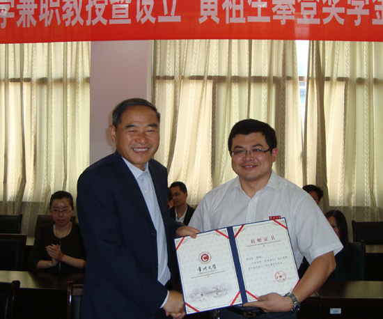 学生处向黄文浩教授颁发奖学金设立证书
