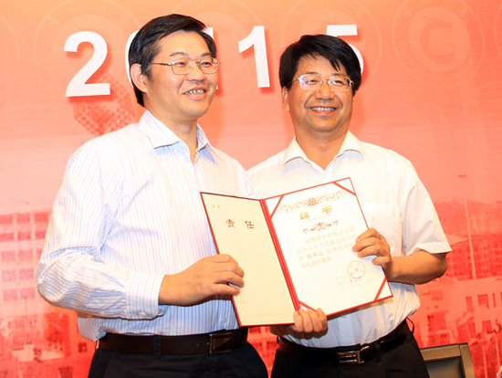 浦玉忠校长为陈和志副总经理颁发常州大学兼职教授聘书