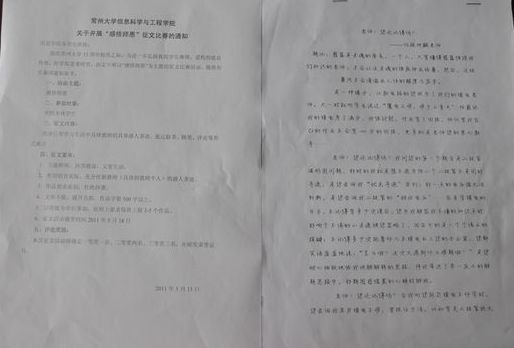 在开展学习景荣春同志活动中,学院涌现出一批优秀教师,5月15日,学院在全体学生中开展“庆校庆 感悟师恩”征文比赛,共收集反映优秀教工先进事迹作品160余篇,评出一等奖一名,二等奖两名,三等奖三名。作品结合了优秀教师日常生活中具体感人事迹,通过叙事、随笔、评论等方式描述了他们在引导学生专业学习、关心学生日常生活、指导学生参加科技竞赛等各方面的感人事迹,点滴小事记载他们在平凡岗位的至上和超越,充分展现了学院教师坚守三尺讲台,立足本职,服务师生,在平凡的岗位做出的不平凡的业绩,践行了一名当代教师的核心价值观。