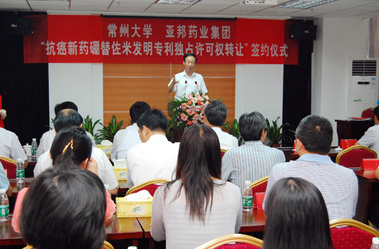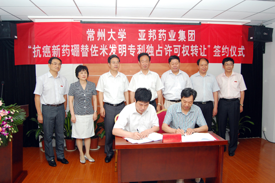 在签约仪式上,常州大学科技处副处长陶国良与亚邦药业集团医药股份公司董事长杨建泽共同为“抗癌新药硼替佐米合成技术及其发明专利独占许可权转让”项目签字。这也标志着常州大学制药学院自主研发的抗癌新药合成新技术找到了最佳的生产企业,为我国抗癌新药的研发和生产做出了新的贡献。