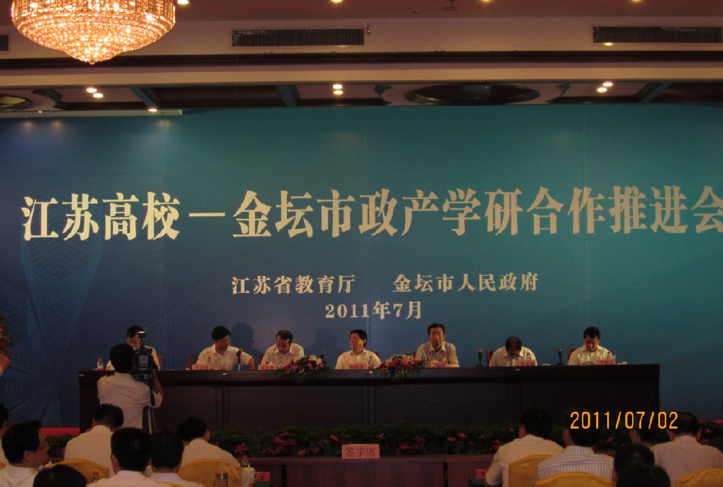 7月2日,副校长丁建宁率队赴金坛市参加2011年江苏高校——金坛市政产学研合作推进会。省委组织部副部长赵永贤、省教育厅副厅长殷翔文、省科技厅副厅长蒋跃建及常州市、金坛市相关领导出席会议。我校科学技术处、资产与实验室管理处相关负责人参加会议。