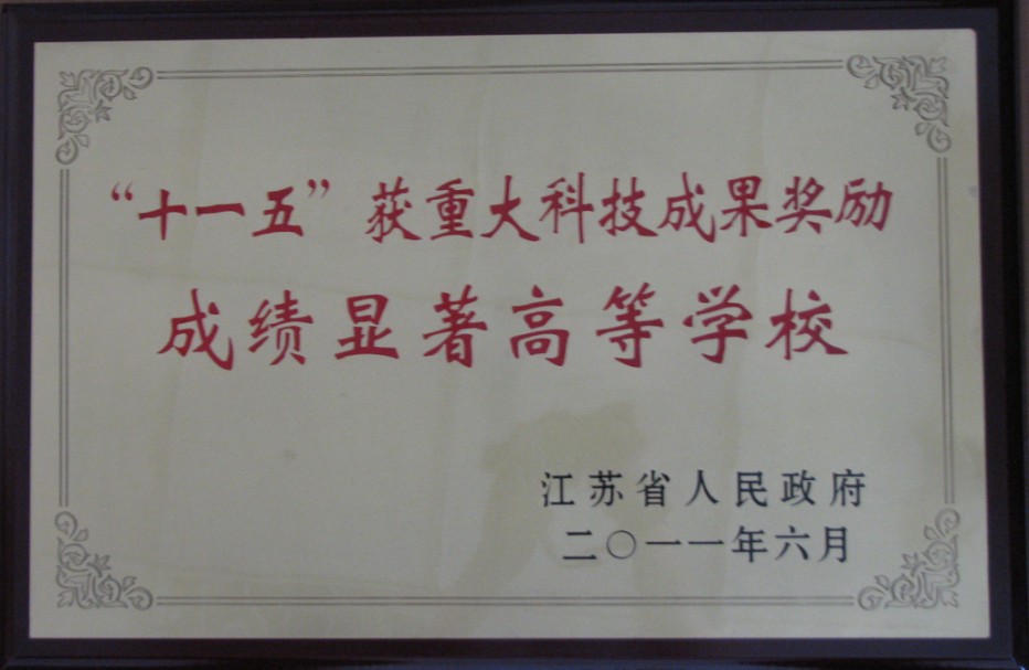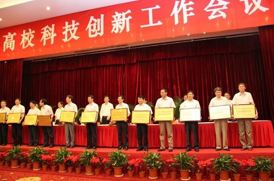 大会对“十一五”期间在科技创新活动中做出突出贡献的24所省内高校进行了表彰。鉴于“十一五”期间在科技成果奖励上的优秀表现,我校被评为“十一五”获重大科技成果奖励成绩显著高等学校。“十一五”以来,我校获国家科技进步二等奖2项,技术发明二等奖1项;获省部级科技进步奖35项,其中一等奖6项。通过省部级科研鉴定93项。出席会议领导为获奖高校颁奖。浦玉忠校长代表我校上台领奖。