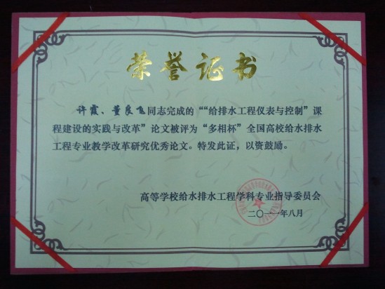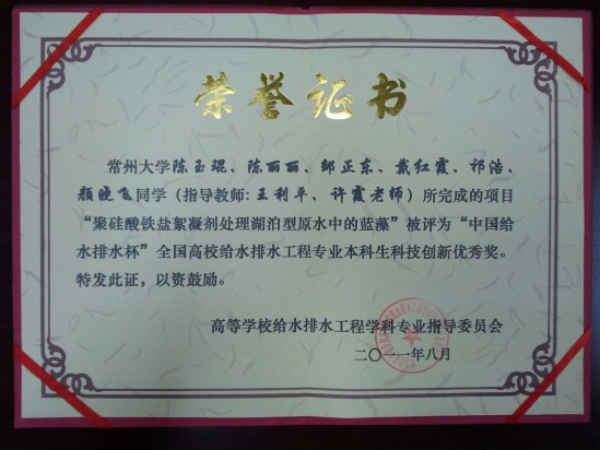 近日,我校师生在全国高等学校给水排水工程学科专业指导委员会议上双双获奖。我校环境与安全工程学院给排水07级陈玉琨、邹正东、祁浩等同学(指导教师:王利平、许霞)所完成的项目“聚硅酸铁盐絮凝剂处理湖泊型原水中的蓝藻”获得全国高校给水排水工程学科专业本科生科技创新优秀奖(不分等级,只设一个优秀奖);由许霞和董良飞老师完成的“《给排水工程仪表与控制》课程建设的实践与改革”获得全国高校给水排水工程学科专业教学改革研究优秀论文奖(不分等级,只设一个优秀奖)。