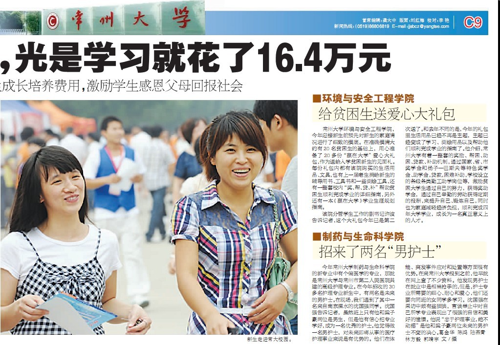 常州大学外国语学院今年给每一位新生家长都发放了一张“子女培养成本核算”调查表,让每位家长计算自孩子出生以来一直到高中的所有培养费用,通过这个费用的计算,请家长写出自己对孩子在大学四年求学时间里所要达到的期望和目标。通过这封信,学校和家长共同帮助新生为自己四年的学业生涯做一个系统科学的规划,为新生未来的发展做好远景规划,使四年大学时光不致荒度。其中一份16.4万培养成本表,让刚入学的新生大吃一惊,她告诉记者,真没想到,父母已经为自己付出了那么多。她觉得,自己没有任何理由荒废自己的大学时光,一定要奋发有为,怀着一份感恩的心来学习、生活和面对社会,最终回报自己的父母,做一个对社会有用的人。