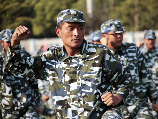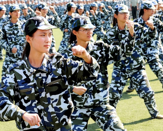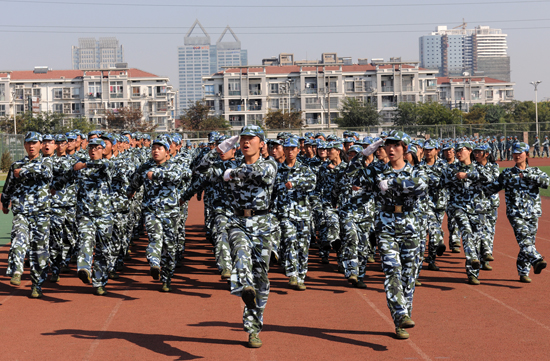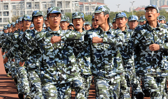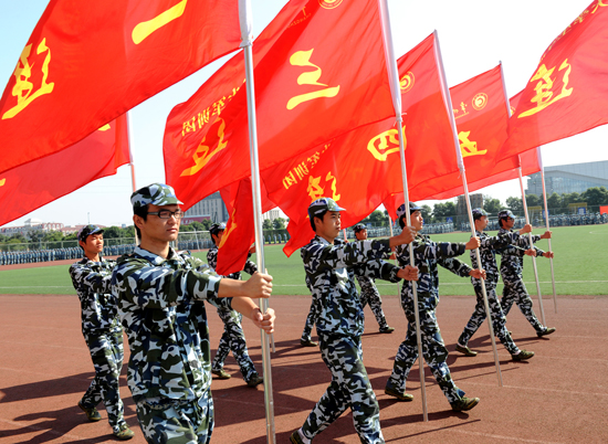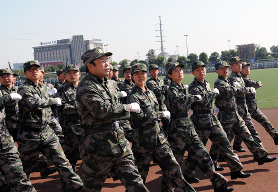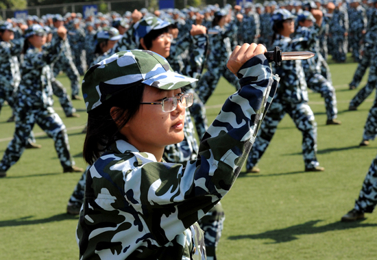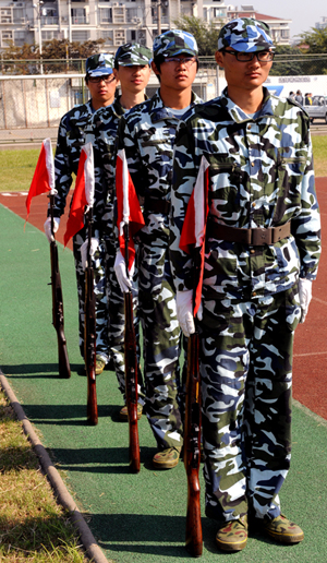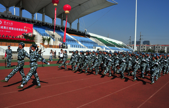 秋色连天,号角连营。由新生辅导员和4500余名新生组成的四十多个方队进行了分列式汇报表演,辅导员方队精神饱满、军姿挺拔,学生方队口号嘹亮、步伐整齐、精神抖擞,作为表演项目的捕俘刀方阵、军体拳方阵、持枪方阵、拉歌方阵等也依次上场,教官学员通力合作,配合默契,每一个动作都力求整齐划一,每一声喊杀都力争气势磅礴,充分展现出2011级新生奋发向上的精神风貌和我校今年军训工作的丰硕成果。