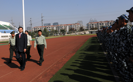 浦玉忠校长在部队首长的陪同下检阅受训方队