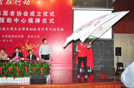 活动仪式上,团市委副书记、市志愿者总会副会长薛晔为常州市法律援助志愿者协会授旗,大学生法律援助志愿者代表作了表态发言。许同禄副厅长、孙国建书记共同为“常州大学法律援助中心”揭牌。