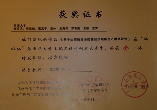 早在今年的六月初,石油化工学院就成立了由陈群副校长任主任、何明阳院长和马江权副院长任副主任、杨基和教授和范正明高工等20多位工科教师组成的化工设计类竞赛指导委员会,经过学生三个多月的精心设计以及教师的悉心指导,继三个设计团队在2011“三井化学杯”第五届大学生化工设计竞赛全国总决赛取得佳绩后,“Chemrocker”团队又勇夺全国化工设计创业大赛金奖,本次获奖是我校石油化工学院持续进行化学工程与工艺国家特色专业建设和落实教育部“卓越工程师教育培养计划”取得的又一代表性成果。
