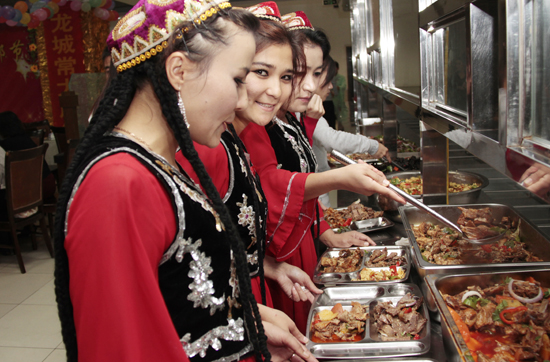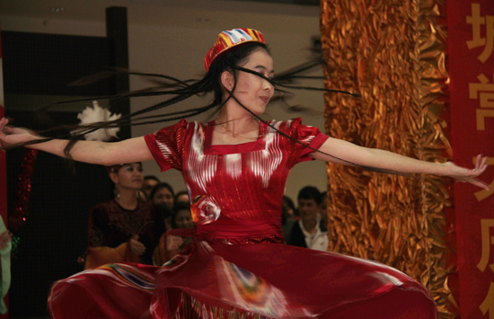 联欢会上,各族师生共同品尝着学校精心准备的民族饭菜,欣赏着由新疆班学员自排自演的精彩节目。维吾尔族、哈萨克族、蒙古族、柯尔克孜族等少数民族学员们用她们富有民族特色的歌舞打动了在场所有观众;吉他弹唱、弹布尔独奏展现了学员们的多才多艺;刚获得校园十佳歌手荣誉的新疆班学员努尔居马演唱的《无风的夜》点燃了观众热情;首批新疆班全体学员演唱的《故乡》深深的勾起所有人的思乡之情;在《哈萨克族的婚礼》短剧中,让我们近距离感受到了哈萨克族婚礼习俗及礼仪文化。哈萨克族学员加哈力拜是第一次在学校过古尔邦节,“本来以为会冷冷清清度过这个节日。没想到学校想得这么周到,让远在异地的我能过上真正的节日。没想到能和老师共同联欢,大家的热情让我感觉很温暖。”连用两个没想到形容自己的激动心情。