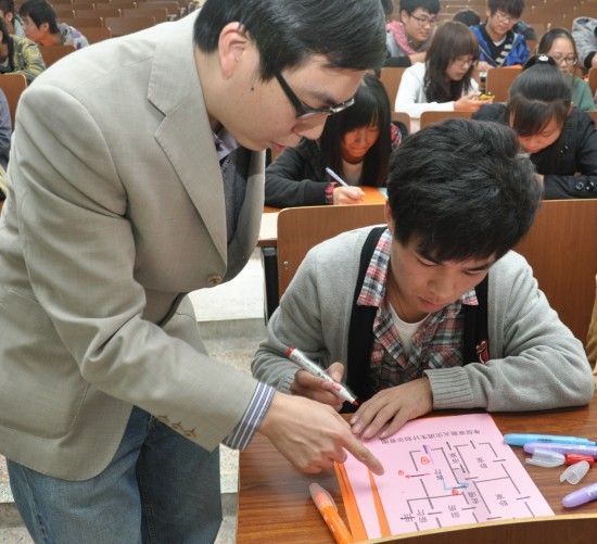 袁雄军老师现场指导学生绘制家庭安全逃生路线图