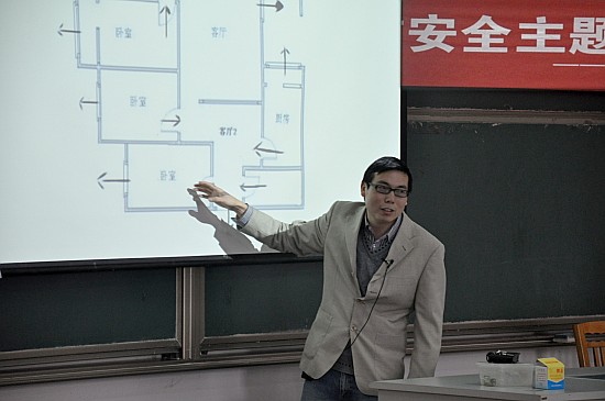 逃生路线图绘制过程中,袁雄军老师特别强调,一是要在图上标出所有可能的逃生出口,务必将家里所有的房门、窗户、楼梯都标注在图上,尤其是居住在多层和高层住宅的城市家庭,逃生路线图中还须标注房屋附近的疏散楼梯,以便家人对紧急情况下的逃生路线一目了然;二是如若可能,尽量为每个房间画出两条逃生路线,房门一般是每个房间的主要逃生出口,但是,如果房门被大火和浓烟封堵,您就需要另外一个逃生出口,例如窗户。所以,一定要确保家里的窗户能够自如开启,并且家里的每个人都清楚知道逃生的路线。如果窗户安装了防盗锁,则一定记得在家里准备锤子等应急工具;三是在住家外面确定一个家里所有人都知道的逃生会合点,一旦火灾发生,家庭成员都直接到会合地点集中,这样能够很快确定所有家庭成员是否全部成功逃生,一棵树、一个公交站台、一座报亭都是不错的选择!而最关键的一点是,每年所有家庭成员务必根据逃生路线图认真演练1-2次火灾逃生模拟训练,最好是全体家庭成员试着从每个房间徒步走向逃生出口,一是为了确定所有的逃生出口是否可以正常使用,二是未雨绸缪、防患于未然,以便在火灾真的发生时,家庭成员就能够在烟、火封堵逃生路线前准确、快速疏散逃生。