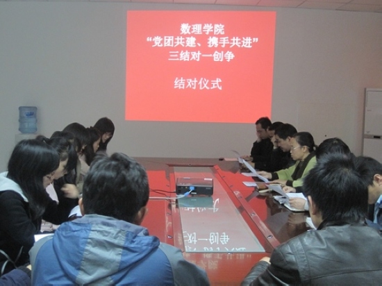 为认真贯彻落实《关于开展基层党建带团建“三结对一创争”活动的意见》的通知精神,通过党团共建,创先争优,促进学院学生党、团支部健康全面发展,构建创新发展能力更强、团员青年参与程度更高的组织运行机制,使学院党团的各项工作迈上新台阶。数理学院于11月23日下午在学院会议室举行“‘党团共建、携手共进’三结对一创争”结对仪式。数理学院党委书记蒋美萍、副院长石澄贤、党委委员陈宪锋老师,以及全体教工党支部、学生党支部、学生团支部负责人参加了会议。会议由学院团委书记薛峰主持。