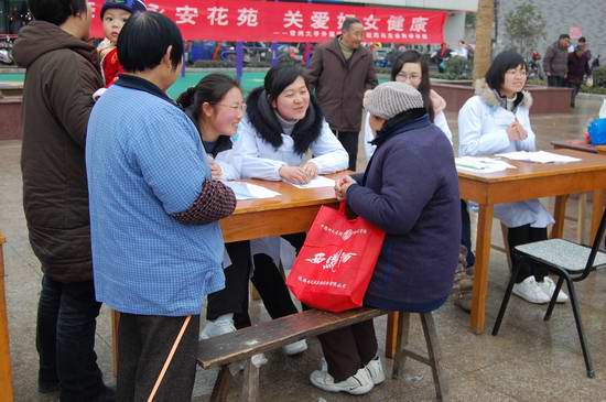 来自外语学院与制药学院的10名志愿者,身穿洁白护士服,不惧寒冷,用热情与微笑为前来咨询的附近居民提供周到细致的宣传与咨询服务。同时志愿者们也向前来咨询的群众发放女性健康知识宣传册,制作精美的宣传册上的健康知识简单、实用、易懂。10名志愿者充分运用自己的课堂知识,针对群众咨询问题,逐一耐心解答。热情周到的宣传和咨询服务,简单实用的健康小常识赢得了前来咨询的社区居民和社区居委会领导的一致赞赏。