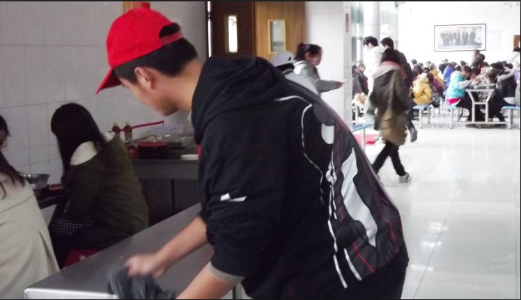 上午,志愿者们在院学生会的组织带领下分两路,第一批志愿者前往各栋本科生宿舍楼,为在节日期间坚守在自己岗位的清洁阿姨们送上节日的礼物并帮助阿姨们一起打扫清洁卫生工作。“阿姨,您辛苦了,祝您节日快乐”一声声节日的祝福,精心准备的礼物,同学们忙碌的身影,让每一位阿姨的脸上绽放出了幸福的笑容。现场一位阿姨略带羞涩地说:“我这还是第一次收到妇女节的礼物呢,谢谢你们还记得我们,还有这么精美的礼物。”看到有的志愿者不会使用阿姨们每天都用来清洁的大拖把,阿姨们更是热情的亲身为同学们示范,手把手的教给他们,志愿者们更是虚心向阿姨们请教,活动现场处处洋溢着志愿者与阿姨们的笑声。上午十点半,第二批志愿者来到食堂,他们刚刚领好自己的清洁工具,马上就迎来了最拥挤的高峰时刻。志愿者们甚至顾不上擦掉额头的汗珠,整整忙碌了两个多小时,一直到最后一批就餐的学生离开食堂他们才得以休息。