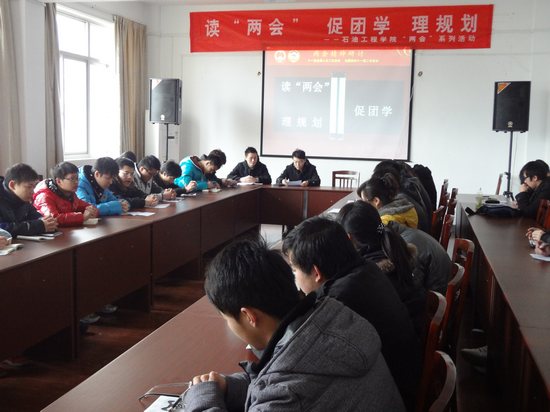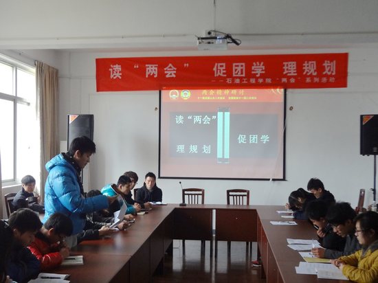 3月16日 石油工程学院读“两会”、促团学、理规划活动在院会议室举行,该院三大社团代表及各班长、团支书参加了此次活动。