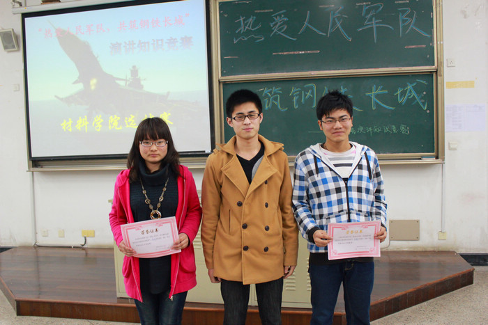 为迎接建团九十周年及党的十八大召开,不断激发在校大学生关心支持国防和军队建设的政治热情,进一步浓厚校园国防教育氛围, 3月28日晚六点,材料学院在十五阶举行了以“热爱人民军队,共筑钢铁长城”为主题的演讲知识竞赛。来自材料学院的二十名学子参加了此次竞赛。