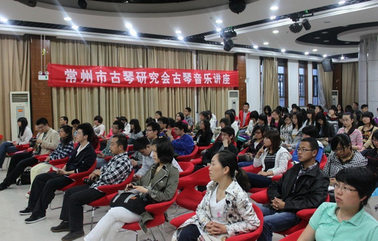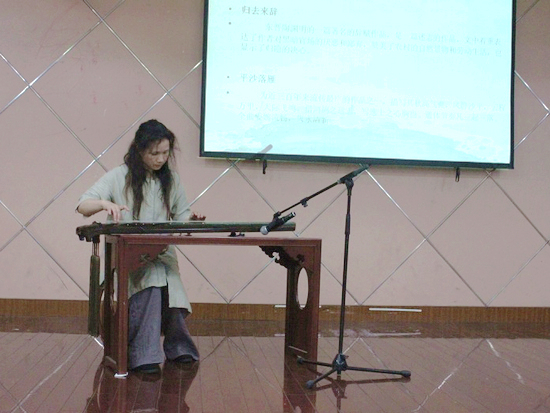 常州市古琴研究会会长杨晖女士首先为大家详细介绍了古琴的起源、结构样式、历史典故等,使学生了解到中国的古琴艺术是一项拥有三千多年历史的被联合国教科文组织所列入的“人类非物质文化遗产”,是世界上现存最古老的活的成熟的音乐艺术。随后,杨晖女士、常州龙吟琴社创始人陈旭东先生等先后为大家现场弹奏了《平沙落雁》、《流水》、《凤求凰》、《归去来辞》、《良宵引》和《忆故人》等古琴名曲,精湛的技艺、倾情的表演、苍古雄健的曲风使在场的学生深深领略到了古琴艺术的古典高雅和独特魅力,让更多的同学去关注和传承中华民族悠久的文化传统和灿烂的文化遗产。