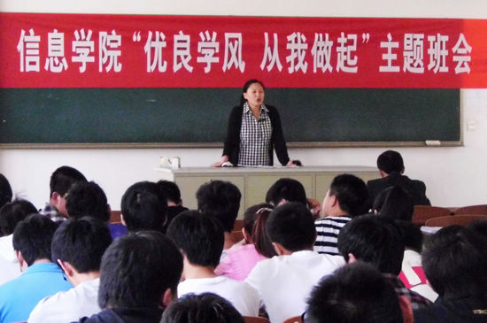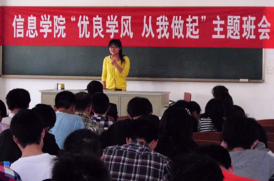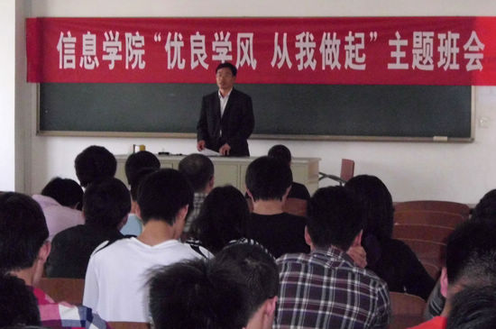 为了进一步推进学业规划、加强学风建设工作,信息学院针对期中学风检查和深入调研反映出来的问题于4月20日至4月26日在各学生班级中分别召开了“优良学风,从我做起”主题班会。班主任老师、辅导员老师均参加了主题班会。