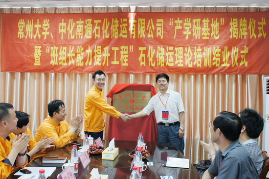 王树立院长和金勇总经理分别代表学校和中化南通石化储运有限公司签订了产学研合作协议,并为“常州大学-中化南通石化储运有限公司产学研合作基地”揭牌。