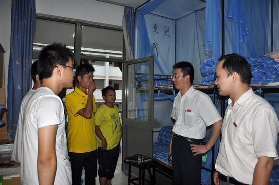 9月12日晚,院党委书记柳铭、副书记储志新在辅导员老师的陪同下一起走进2012级新生宿舍,查看新生住宿情况并对同学们进行了亲切的慰问。院领导每到一宿舍仔细询问同学们报到是否顺利,饮食是否合口,对学院的各项安排是否满意,家庭经济是否有困难等一系列细节问题,鼓励新生及时向学院反映他们在生活、学习中遇到的困难和问题。