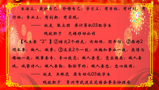 在学校喜迎2012级新生入学之际,信息学院部分校友也从全国各地送来了他们衷心的祝福,在祝贺2012级学弟学妹们考入常州大学的同时,还结合自己在大学里的学习、生活经验和进入社会工作后的感受寄语学弟学妹,希望学弟学妹好好珍惜大学生活,规划好自己的学业,踏踏实实,一步一步走向成功。