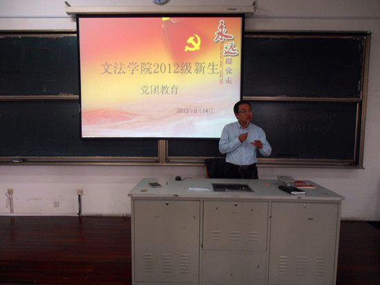 本次教育旨在加强2012级新生对党团的认识,两位老师从党团的基础知识讲起,指出作为一名当代大学生,应对党团知识有着充分的理解,对党团抱以崇高的敬意。并对大学生入党的具体步骤作出详细介绍,鼓励大一新生积极主动提出入党申请。最后薛老师希望同学们要努力践行党员标准,在平时的学习、生活中严格要求自己,积极地向党组织靠拢。蒋老师也用了十六个字:“内强素质,外塑形象,学习理论,加强实践”来勉励在座新生。