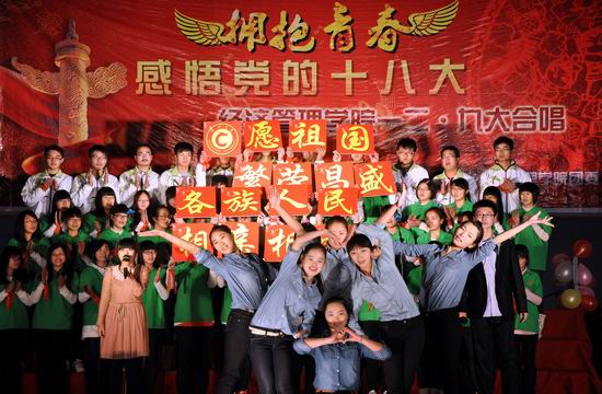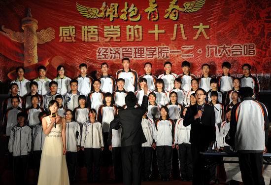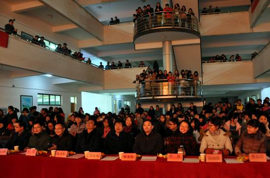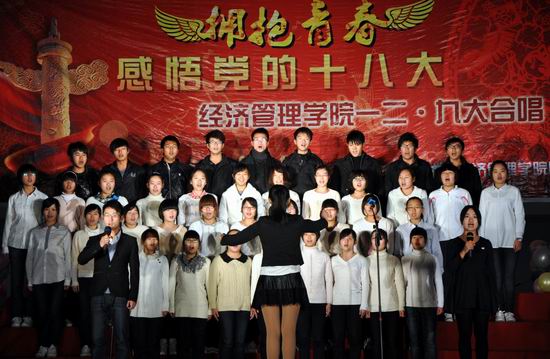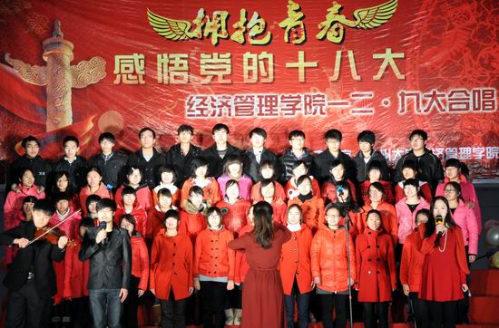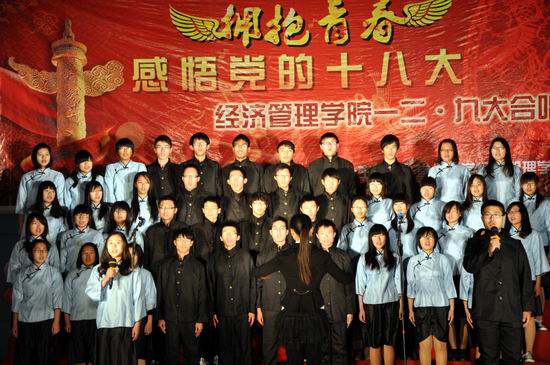 为纪念“一二·九”爱国学生运动77周年,弘扬和传承“一二·九”运动精神,增强青年大学生的社会责任感和历史使命感,展现学生朝气蓬勃、积极向上的精神风貌,12月9日晚,“拥抱青春,感悟党的十八大”——经管学院“一二·九”大合唱比赛在教学辅楼大厅顺利举行。院党委书记王永利、党委副书记陈曙钧、会计系主任陈玉荣教授应邀出席了本次比赛,并与学工办全体老师担任了比赛评委。