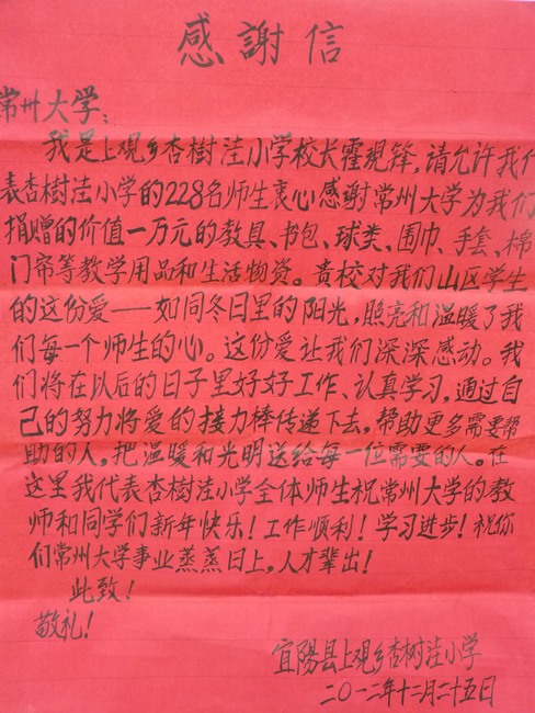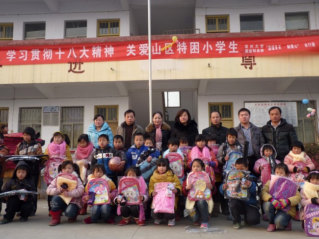 宜阳县上观乡杏树洼小学坐落在宜阳县贫困山区,学校现有学生218人,绝大部分学生因家庭距离学校太远、山路艰险而住在学校,有很多留守儿童更是长期住校。临近岁末寒冬,很多贫困学生还衣物单薄,缺少学习、体育用品。我校在了解到这一情况后,在校内开展了“爱心汇聚力量,留守不再迷茫”为宜阳山区贫困学生爱心捐赠活动,全校师生踊跃捐款捐物,积极奉献爱心,捐赠了价值一万余元的御寒衣物、学习用品和体育器材,在寒冷的冬日里给山区贫困学生送去了常大师生的拳拳爱心和温暖祝福。