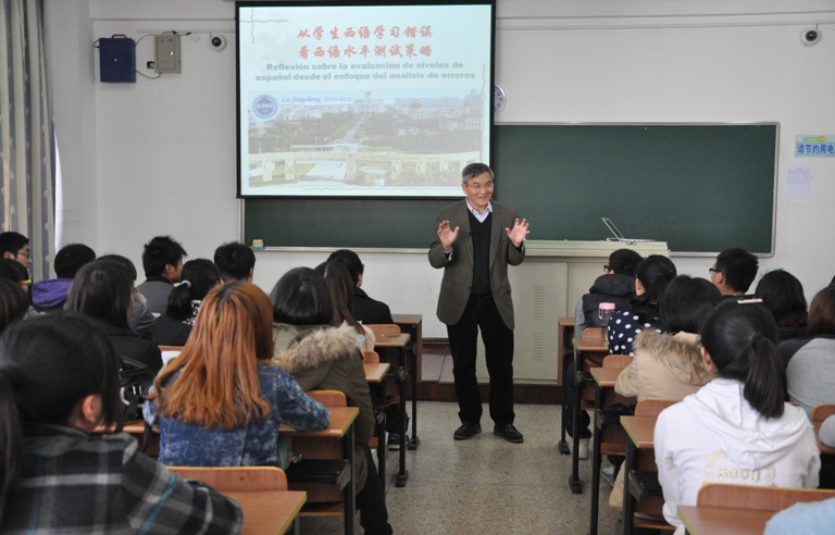 陆经生教授与西班牙语系教师在西语教研室就西班牙语专业建设、教学方法、专四备考策略等问题进行了深入的交流。陆教授在多媒体教室为西班牙语专业全体师生作了题为“从学生西语学习错误看西语水平测试策略”的讲座。陆教授分析了西班牙语专业毕业生的就业趋势,他从发音、词汇、语法规则、书写、母语干扰、翻译等方面分析西班牙语专业四级测试题的典型错误,希望同学们在学习中能巩固已学内容、熟悉考试题型、用科学的方法分析错误,养成良好的学习习惯。陆教授认为本科低年级的学生应注重语音语法等基础方面的训练。他把外语学习比作正在建造的楼房,只有夯实地基,楼房才能宏伟壮观。讲座后,同学们就专四备考过程中的困惑和疑问踊跃地提问,陆教授耐心细致地回答了同学们的问题。