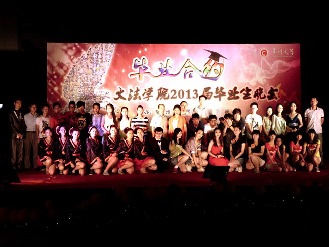 6月16日晚,文法学院以“毕业合约”为主题的2013届毕业生晚会在水月广场举行。文法学院与艺术学院党委书记胡学琦、副书记薛勇、部分毕业生导师、全体学工老师出席了晚会。