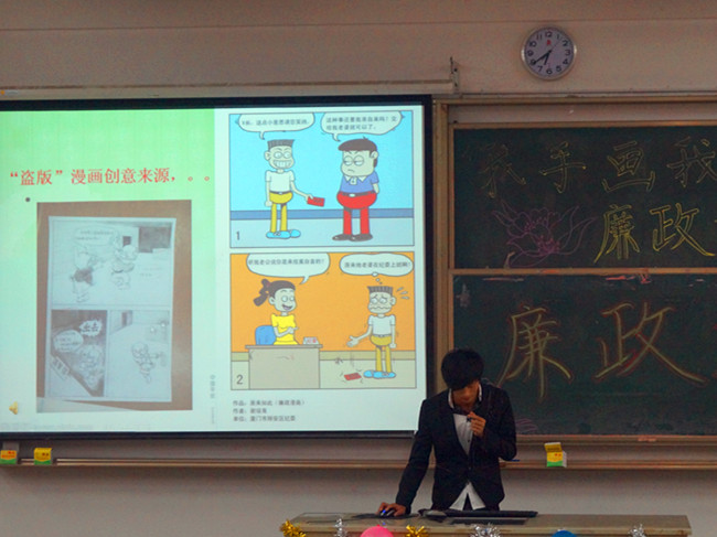 比赛中,各组选手结合当前时事热点、围绕反腐倡廉主题,通过PPT展示对漫画作品做了精彩讲解,从不同角度大唱廉政之风,或是对贪污腐败的深恶痛绝和对反腐倡廉的歌颂,或是对“腐败”现象的讽刺鞭挞,件件作品令人印象深刻,赢得在场师生的广泛共鸣,切实增强了廉政教育的感染力、影响力和吸引力。陈辉老师和陈灿老师分别针对每组作品都进行了细致点评,并给予了进一步修改建议。活动中,主持人还就反腐倡廉方面的知识与观众进行了现场互动与交流。经过激烈角逐,视觉传达131班杨博文同学获得冠军。