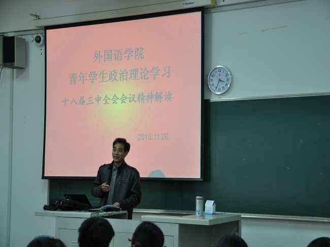 11月21日下午,外国语学院在主楼W1610举办青年学生政治理论学习之学习十八届三中全会会议精神,院关工委副主任范嘉碧老师、学工办老师和全体学生党员、入党积极分子、团学骨干等参加了学习。