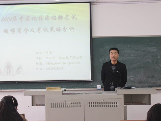中国石化2014年度毕业生招聘统一初选考试将于2013年12月28日举行,为了帮助学生熟悉中国石化校园招聘的流程,做好考试、面试等各方面的准备工作,石油化工学院于12月7日上午,在W1310教室举办了中国石化应试技巧经验交流会,本次交流会邀请了今年刚刚入职中国石化宁波工程公司的傅亮和在去年初选考试中取得好成绩的谭倩与大家进行交流。