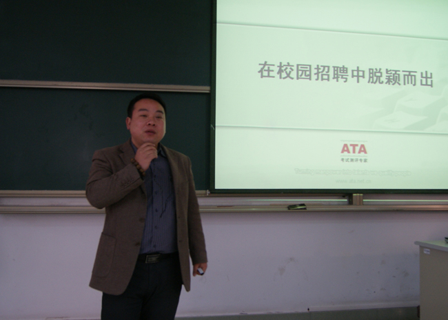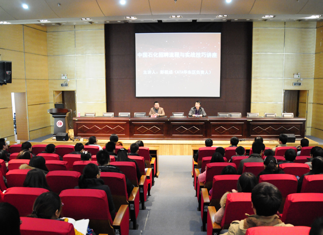 12月11日下午,我校分别在武进校区文彰楼报告厅和白云校区南1阶举办了“中国石化招聘流程与实战技巧” 讲座。讲座邀请了ATA考试公司华东地区负责人彭祖成主讲,讲座由学生处副处长周晓东主持。