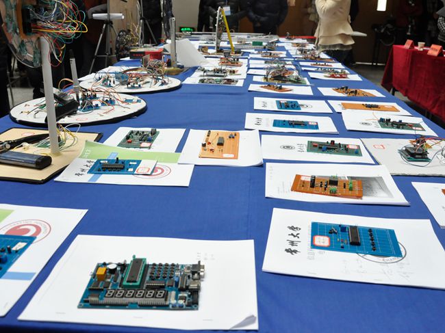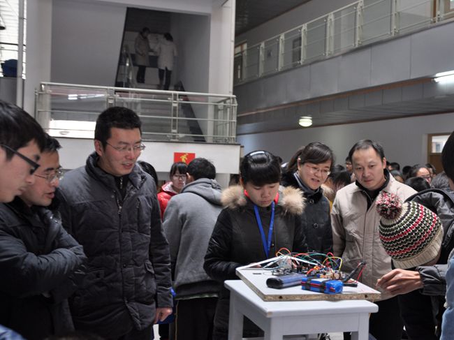 本次大赛面向全校学生展开,根据学生所学专业、知识的不同特分高、低年级两个级别,涉及的题目有七个,分别为激光打靶游戏机、音频信号发生器、自动停泊智能车、基于自由摆的平板控制系统、数控直流恒流源、特殊脉冲信号发生器、立体声音频功率放大器,此次大赛共收到来自全校92件设计作品。比赛开始前参赛作品统一放置在展览台,作品外形新颖,各具特色,仅从外观就得到了老师们的一致好评。比赛期间,选手通过专业的调试来展示他们的成果,从小组成员之间的默契配合,来凸显他们超强的合作学习能力。