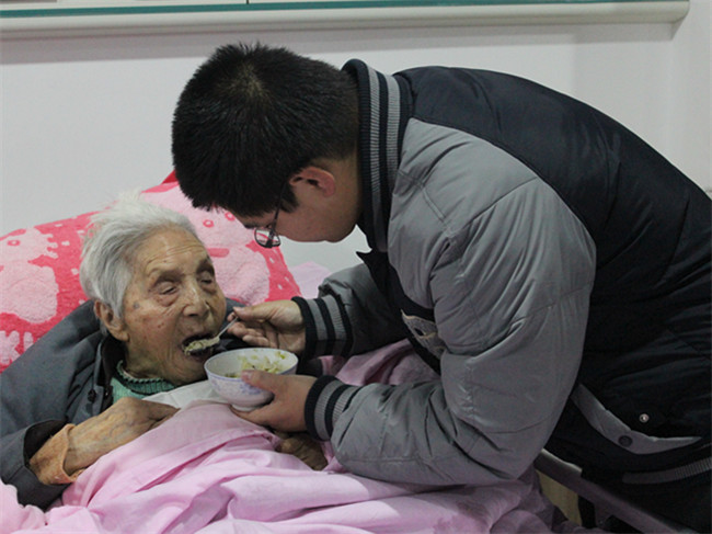 虽然外面微雨阵阵,但这儿却透着股股温情。学生会的每位同学都细心地照顾着老人。此时正值午饭时间,每位同学都手捧饭碗,用心的喂着老人吃饭,不时的吹一吹,害怕烫着老人,他们细心的替老人擦着嘴角,帮助护工将老人抬到另一张床上。午饭后,他们热情的和老人聊天,不时讲一些小趣闻,逗着老人开怀大笑。疗养院内,处处展现着老人们幸福而又满足的笑脸,似乎天气突然转晴,阳光明媚。