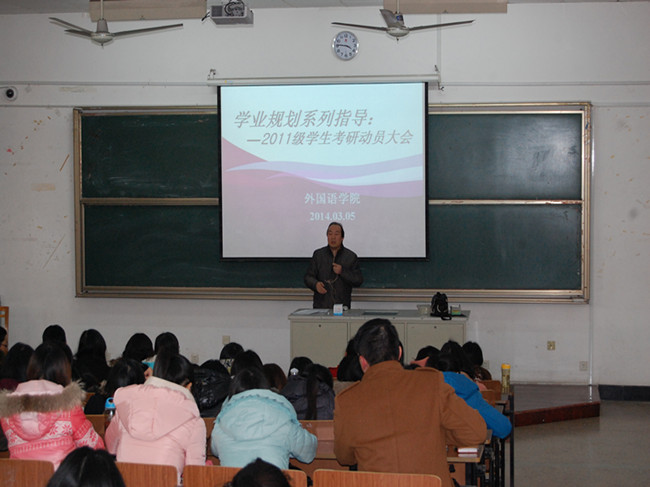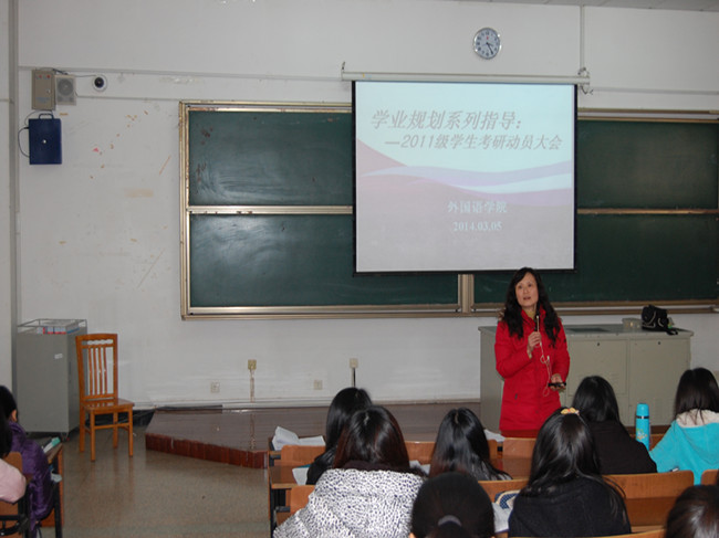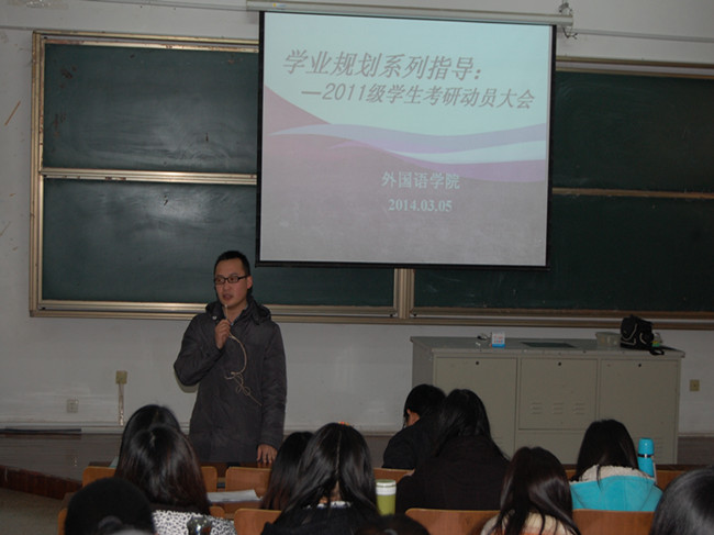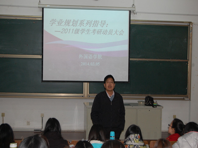 3月5日下午,外国语学院2011级学生学业规划之考研动员大会于W8阶梯教室举行。外国语学院院长薛荣、院党委副书记谢章丽、英语专业李敦东老师、陈磊老师和日语专业陈林俊老师应邀担任主讲,11级两百余名学生参会。