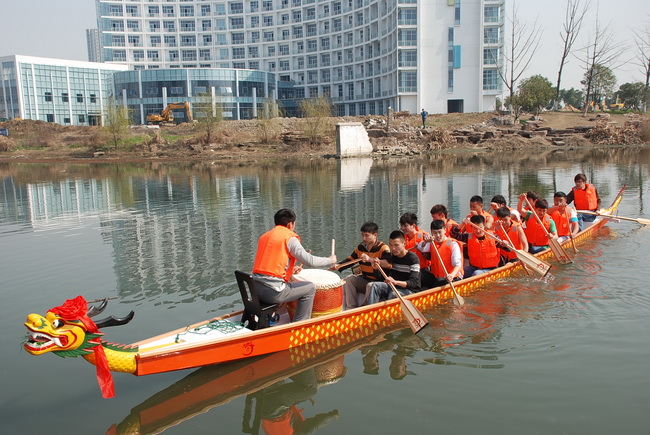 为了弘扬中华龙文化,体现龙城特色,同时为了备战江苏省第十八届省运会高校部龙舟比赛,我校组建了龙舟队。上午10时18分,张笋副院长按照中华龙文化习俗为龙舟下水完成了点睛仪式,拉开了我校“打造以龙文化为主题元素的特色品牌运动项目”活动的帷幕。随后,在教练员于楼成、徐冰的带领下,龙舟队进行了首次水上训练。