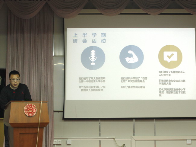 会上,研会代表认真听取了南京大学化学化工学院第九届研会主席团的工作报告及南京大学化学化工学院党委副书记陈露洪老师的讲话。随后观摩了南京大学化学化工学院第十届研会主席团的竞选演讲。